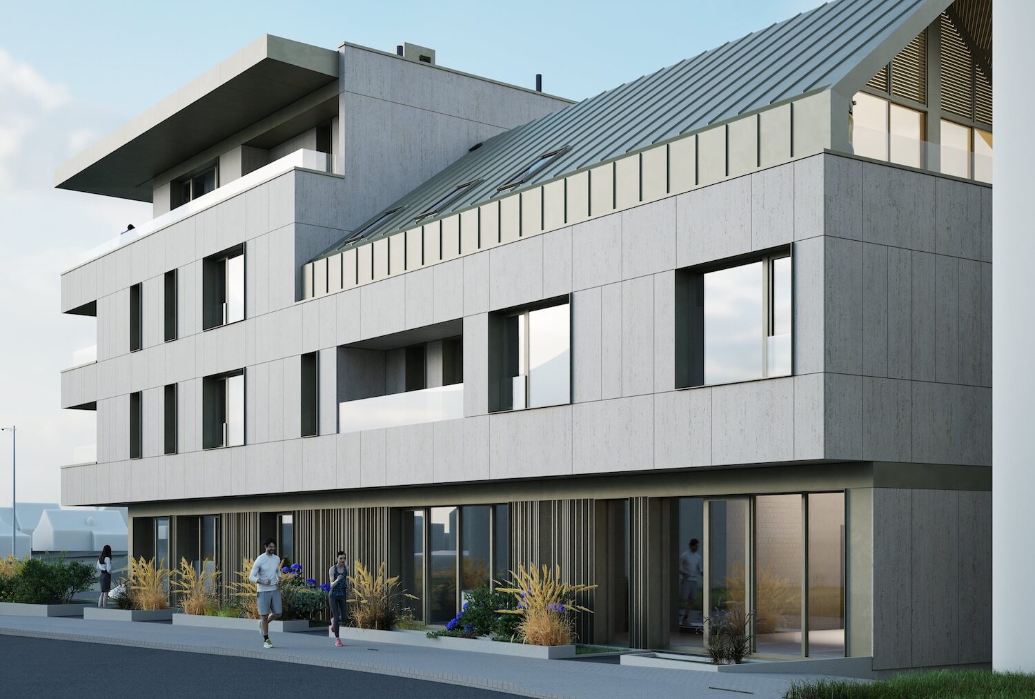 Le programme se décompose en deux volumes bâtis distincts : le volume principal présente trois niveaux pleins et un étage en retrait, surmonté d’une toiture plate contemporaine, tandis que le second volume, de deux niveaux plus comble aménagé, est couvert d’une toiture à double pente, assurant la continuité avec le gabarit et la typologie des constructions avoisinantes.