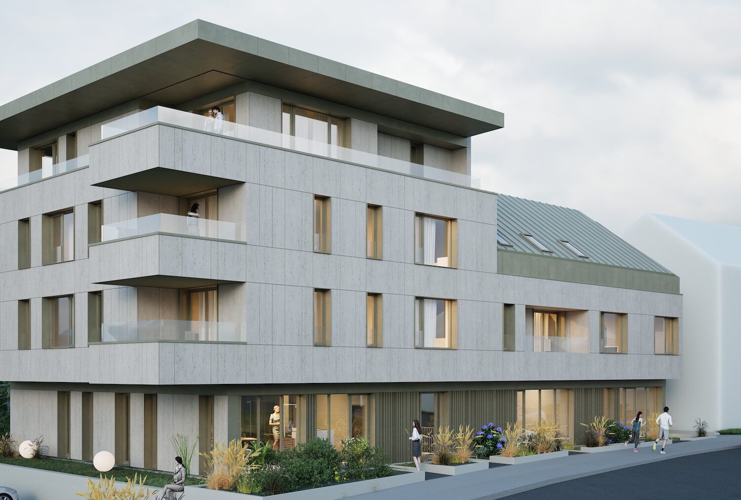 Les accès aux logements et aux commerces sont dissociés, garantissant une séparation fonctionnelle optimale et une circulation fluide. L’implantation des bâtiments et la configuration des espaces extérieurs favorisent une densification maîtrisée, tout en préservant la lisibilité urbaine, les perspectives visuelles et l’intégration harmonieuse dans le tissu bâti existant.