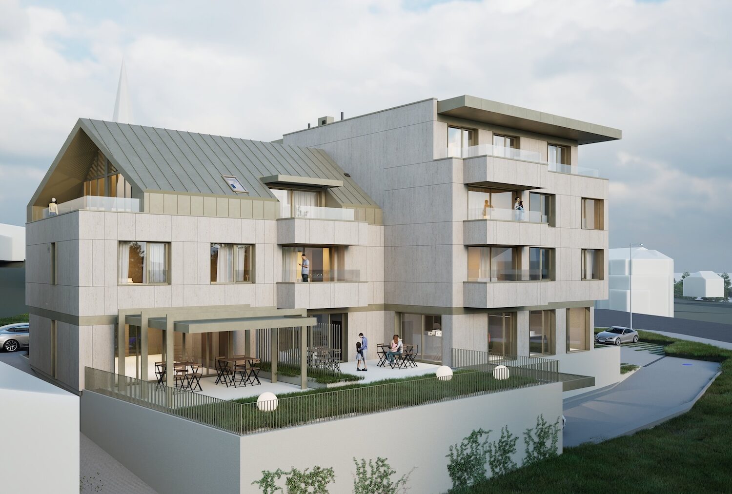 Le PAP de Schouweiler est implanté à l’entrée de la rue de l’Église depuis la route de Longwy sur une parcelle précédemment occupée par un restaurant. Le projet prévoit la construction d’un immeuble à usage mixte, comprenant huit logements résidentiels à l’étage et un socle commercial conservant la vocation historique du site. Les stationnements extérieurs semi-perméables sont dimensionnés pour les usagers et permettent une gestion durable des eaux pluviales.